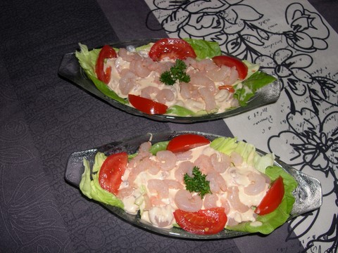Décorez de 3 crevettes entières cuites, un brin de persil et de quelques tomates cerises (facultatif)