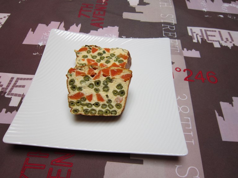 Rangez les haricots dans le sens de la longueur dans un moule à cake beurré, en alternant avec les carottes et versez du mélange oeufs, crème, au fur et à mesure.