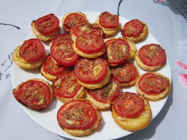 Posez alors sur chaque pizza 1 lamelle de gruyère badigeonnée de moutarde, 1 rondelle de tomate et remettez à cuire 15 mn, au milieu du four.