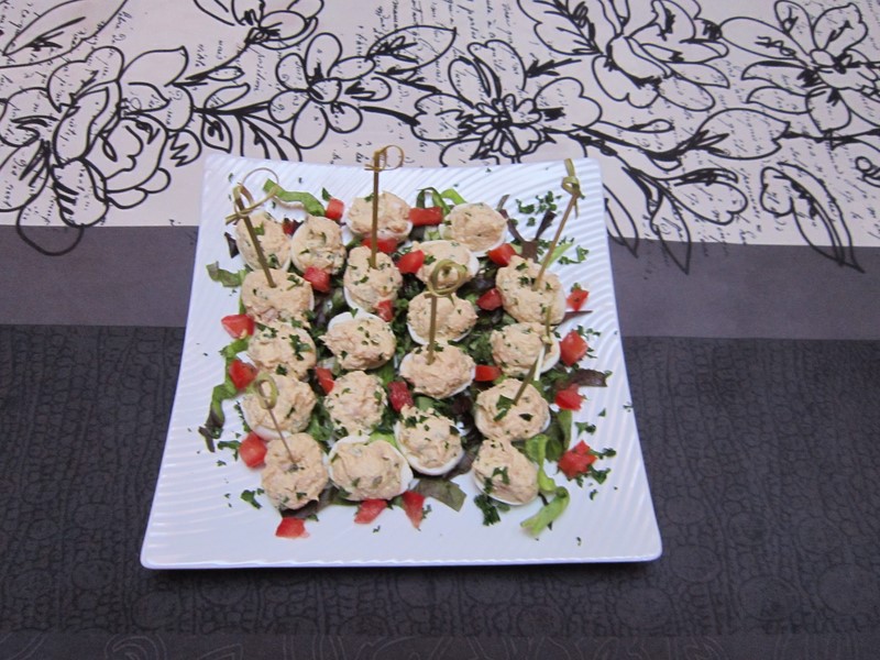 Pilez-les avec le contenu de la boite de thon émietté, ajoutez la moutarde, le persil, les cornichons et la mayonnaise.