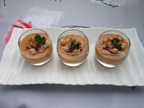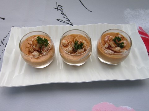 PANNA COTTA A LA BISQUE DE HOMARD, CREVETTES AU COGNAC ET PIMENT D'ESPELETTE