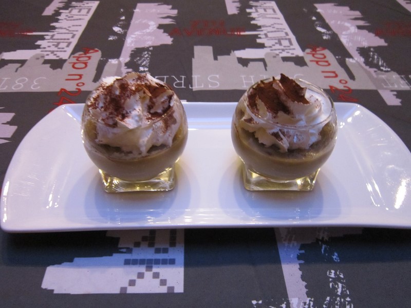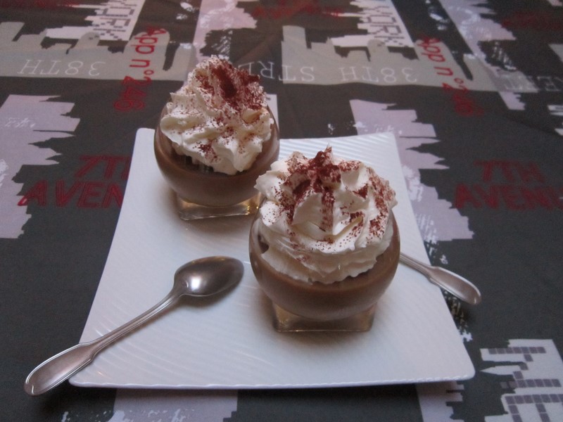 Avant de servir, montez la crème avec le sucre glace et disposez-la sur les crèmes au café.