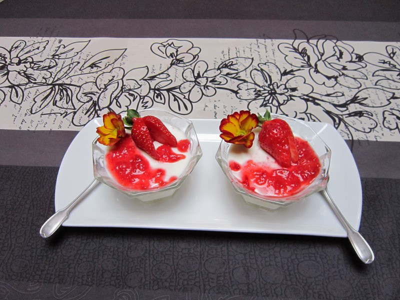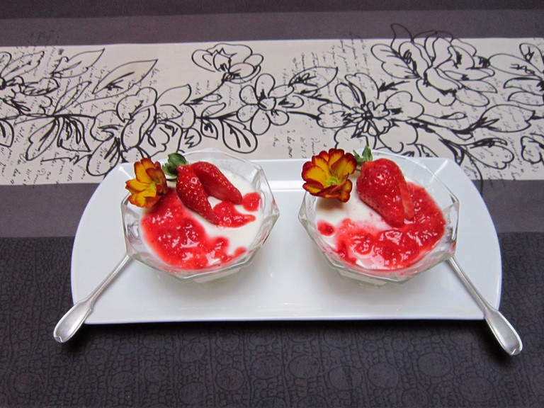 Verser sur les crèmes 2 cuillères à soupe de coulis, décorer des fraises ouvertes et servir