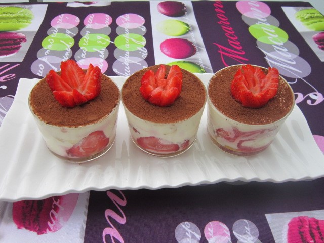 Dressez vos verrines en alternant coulis et morceaux de fraises, biscuits trempés dans le sirop menthe/basilic, puis la crème, répétez l'opération jusqu'en haut de votre contenant.
