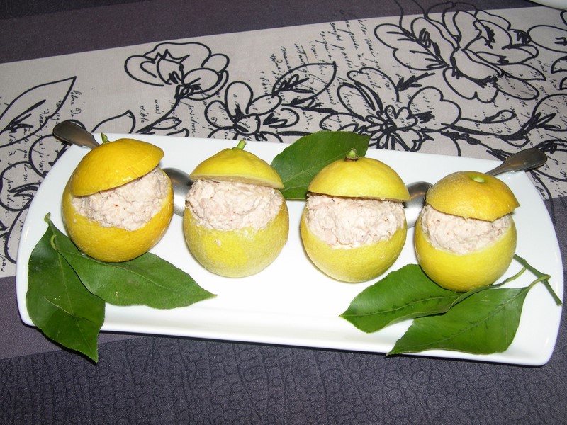 Pour ma part pour 4 citrons, j'ai utilisé 200 g de thon net égoutté et 2 petits-suisses, pour le citron c'est à votre goût et pour le piment d'espelette, j'ai ajouté avec le sel et le poivre.