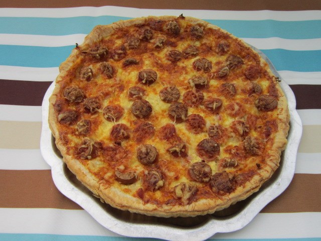 Pour ma part j'ai mis 300 gr de choucroute 75 gr de lardons fumés et 2 saucisses de Francfort et utilisée la crème liquide à 15 % mat.gr et 100g de comté râpé.